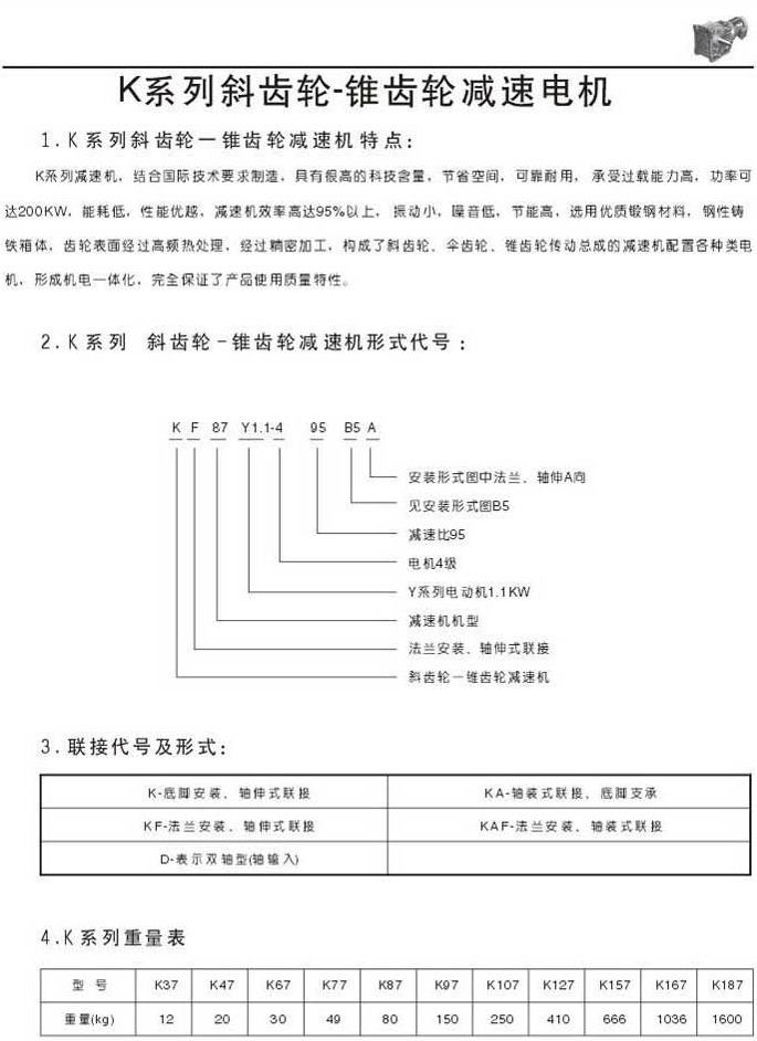 K系列斜齒輪-錐齒輪減速機特點型號表示法聯結代號及形式重量表